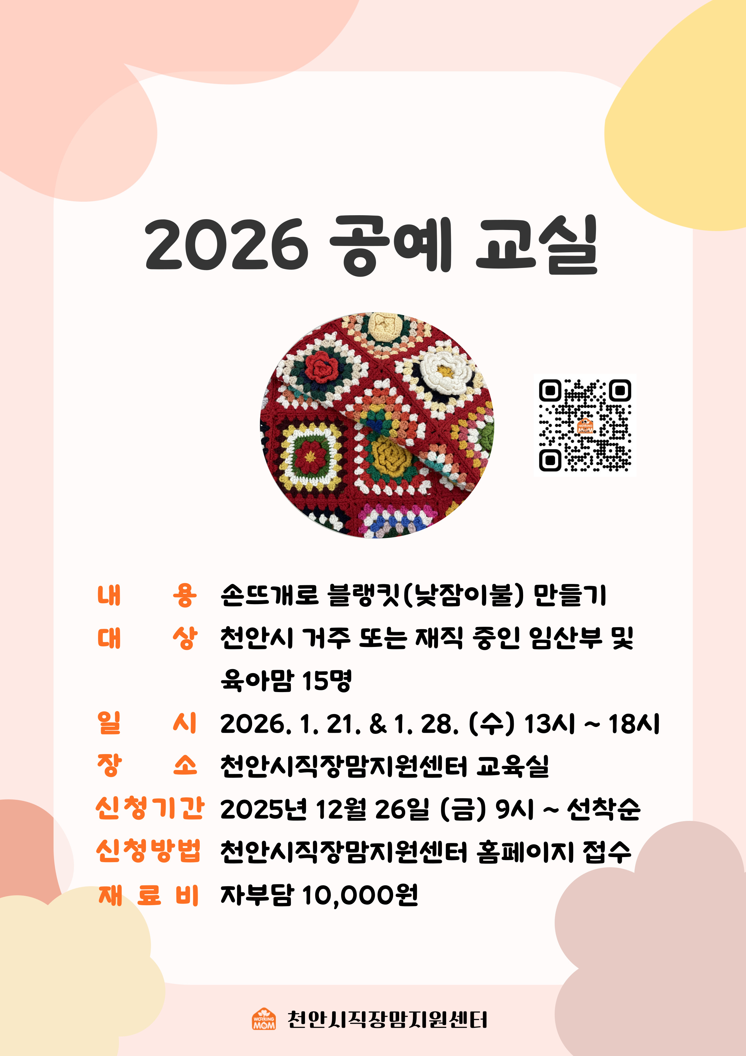 임산부와 육아맘들의 힐링 프로그램 "2026 공예 교실"을 2026년 1월 7일부터 매주 수요일마다 진행합니다 ❤️