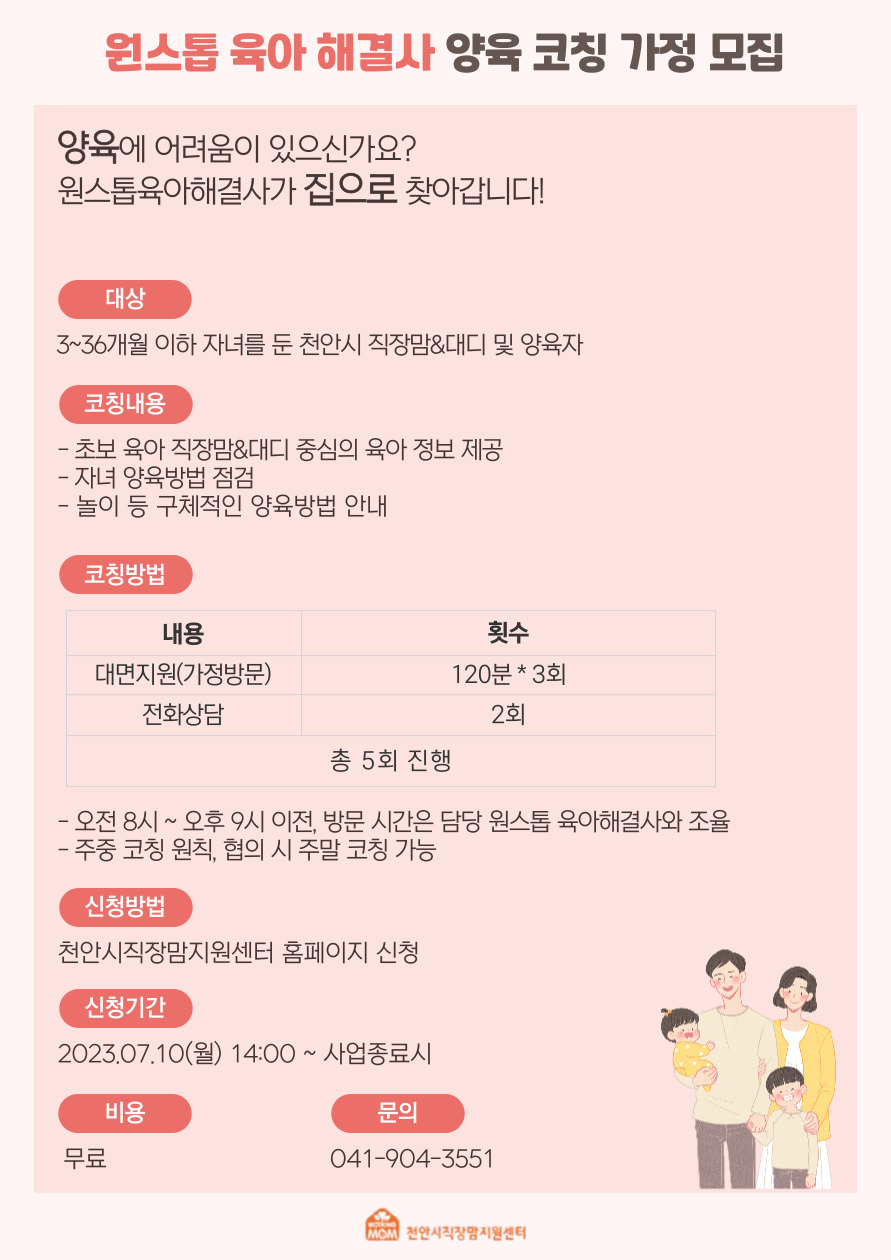 대상은 천안시 관내에 거주하며 3~36개월이하의 자녀를 둔 직장맘&대디 및 양육자입니다.