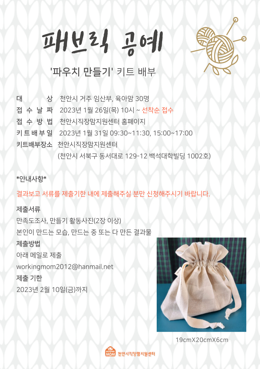 패브릭공예 '파우치 만들기' 키트 배부를 진행합니다.