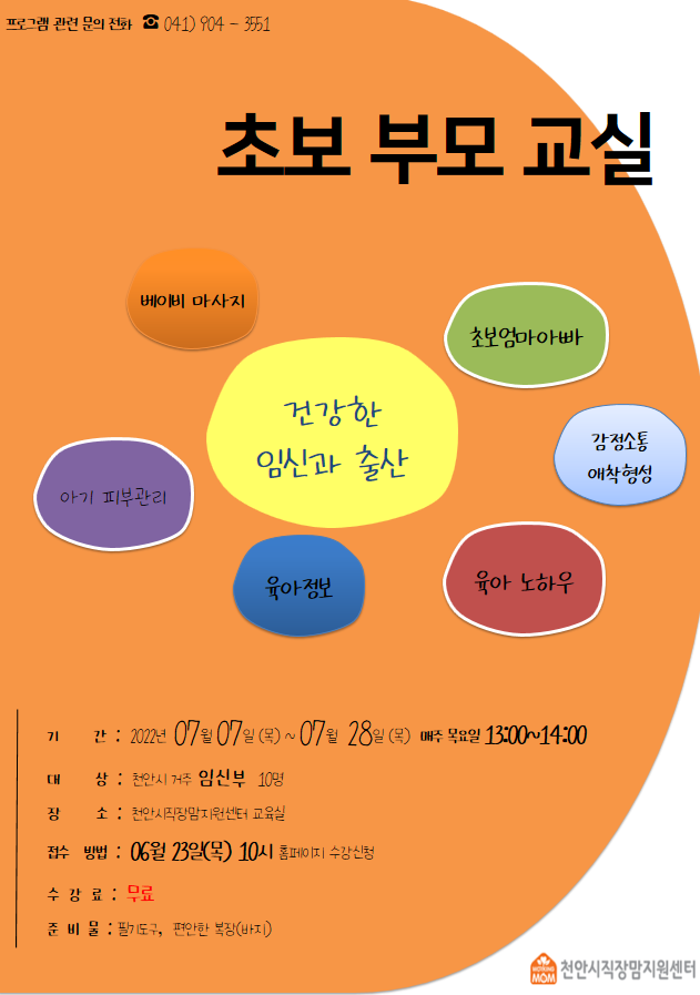 천안시직장맘지원센터에서는 7월 초보부모교실을 진행하고자 합니다.