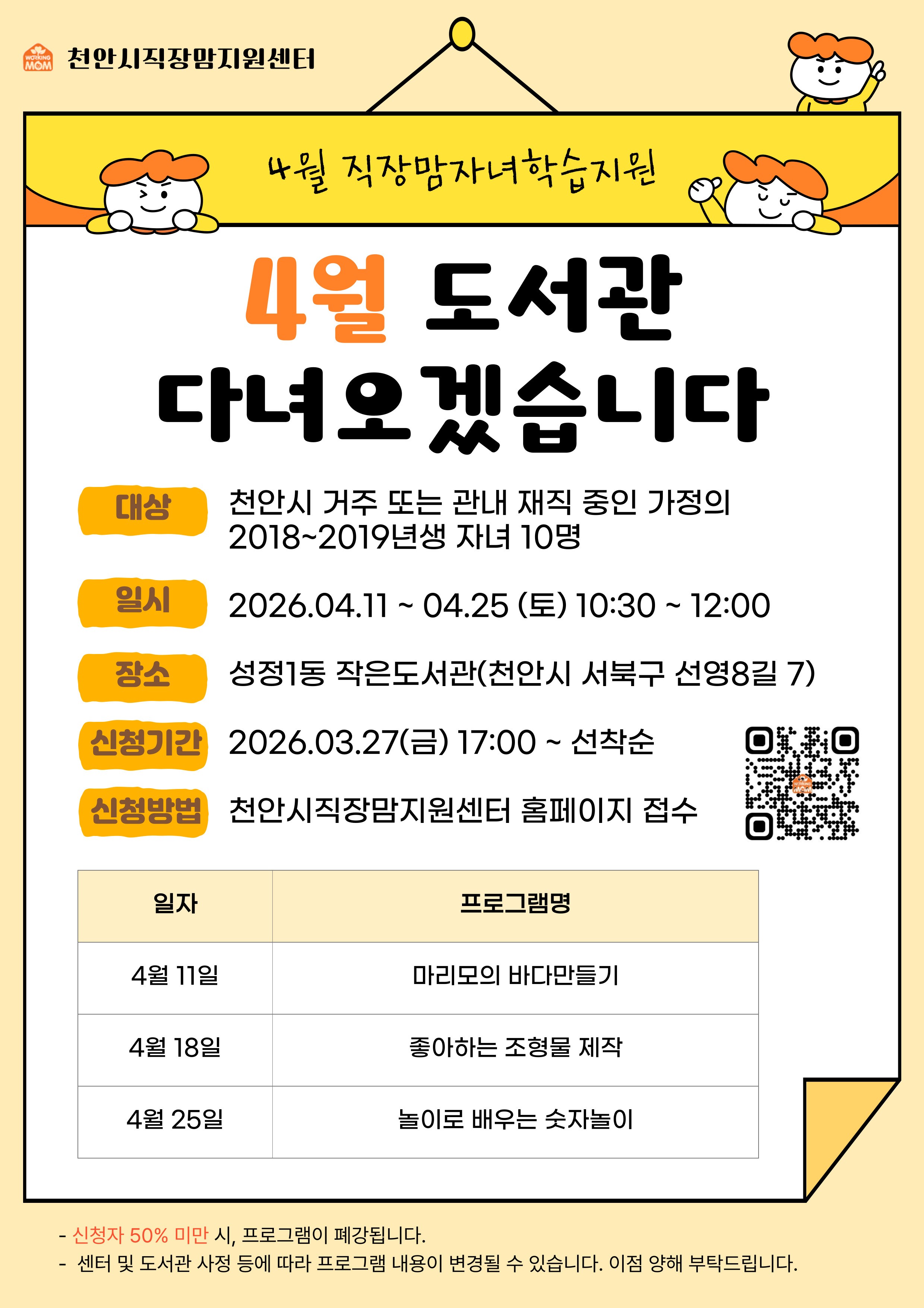- 천안시 거주 또는 관내 직장 재직중인 가정의 2018~2019년생 자녀만 신청 가능 (프로그램 당일 등본(종이 또는 사진) 확인 후, 프로그램 참여 가능)