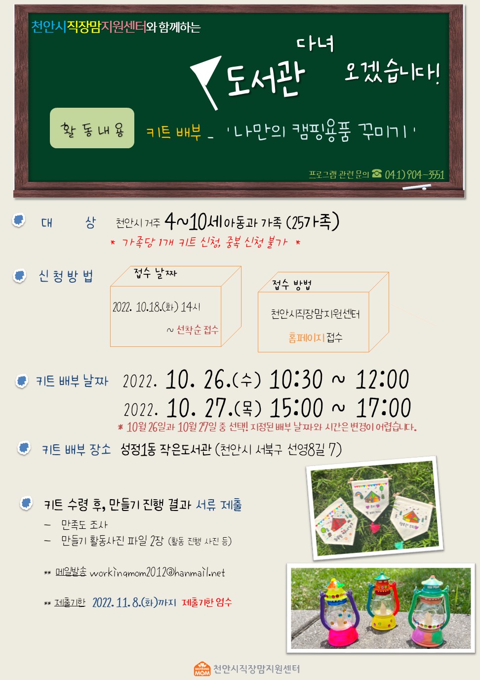 10월 도서관 다녀오겠습니다 프로그램으로 '나만의 캠핑용품 꾸미기' 키트 배부를 진행합니다.