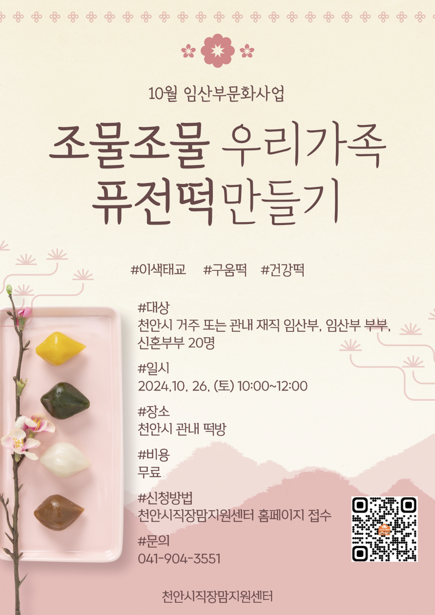 10월 임산부문화사업은 '조물조물 우리가족 퓨전떡만들기'로 진행됩니다.