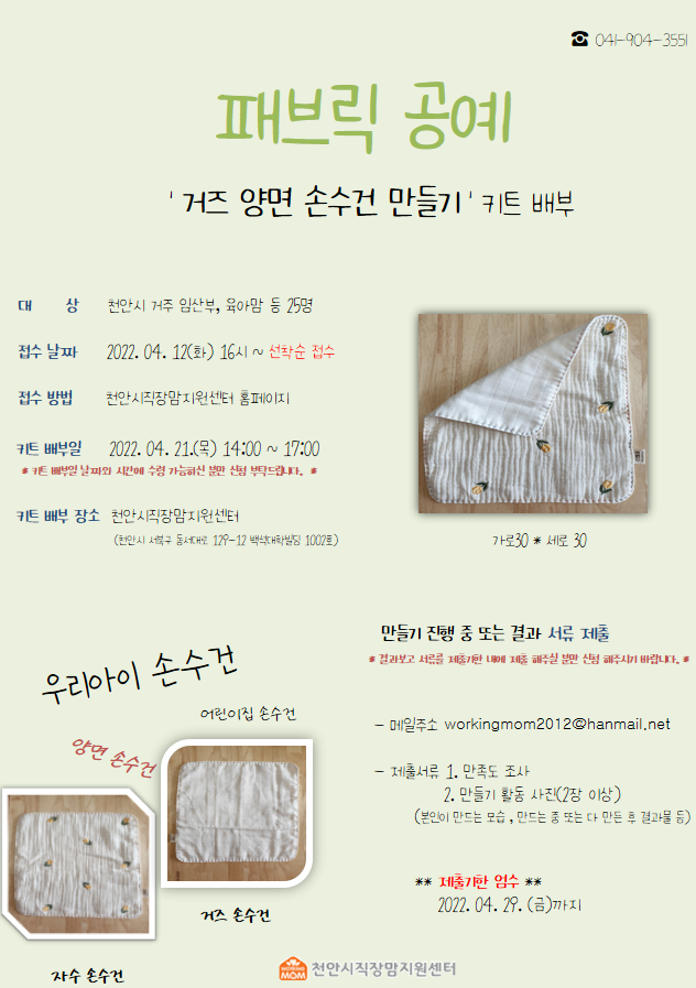 패브릭공예 '거즈양면 손수건 만들기' 키트 배부를 진행합니다.