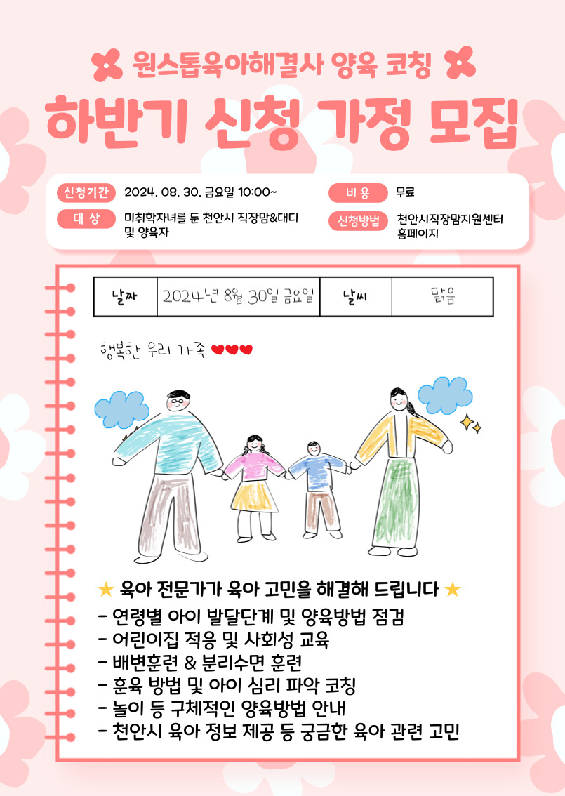 ✅ 대상 : 천안시 관내에 거주하며 미취학자녀를 둔 직장맘&대디 및 양육자