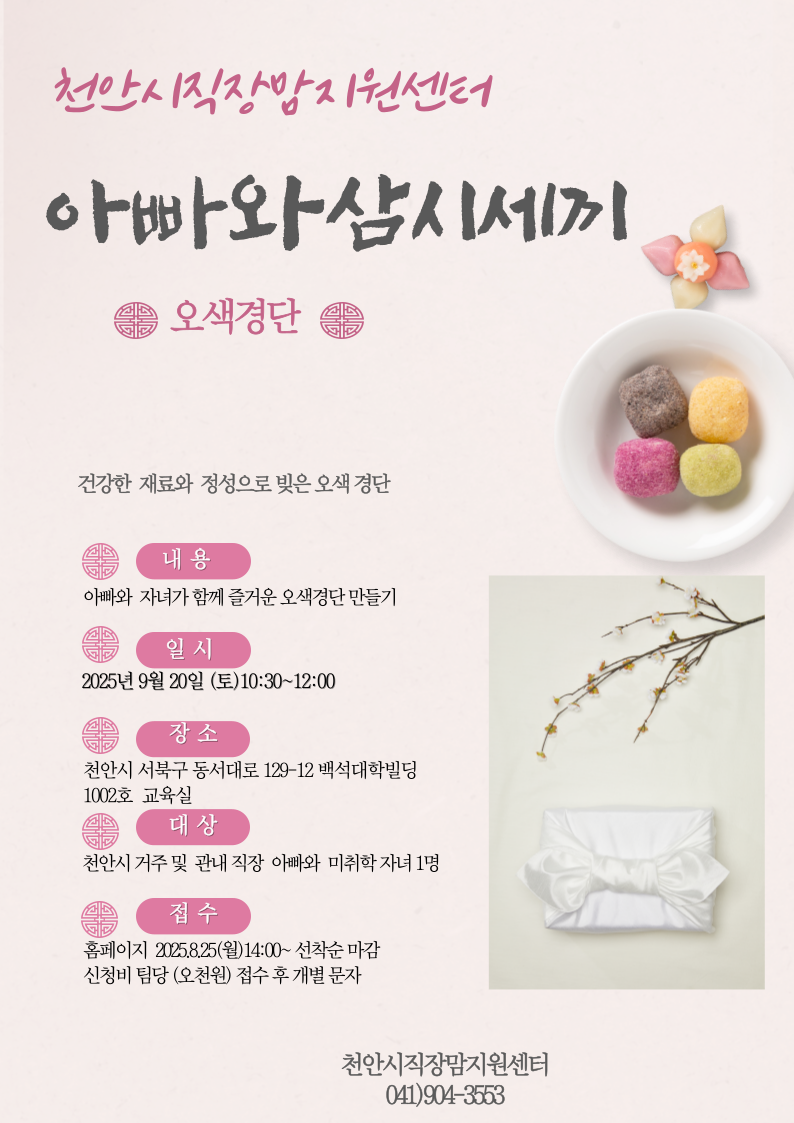대 상: 천안시 거주 또는 관내 직장 아빠와 미취학 자녀1명(2019년~2021년생까지)