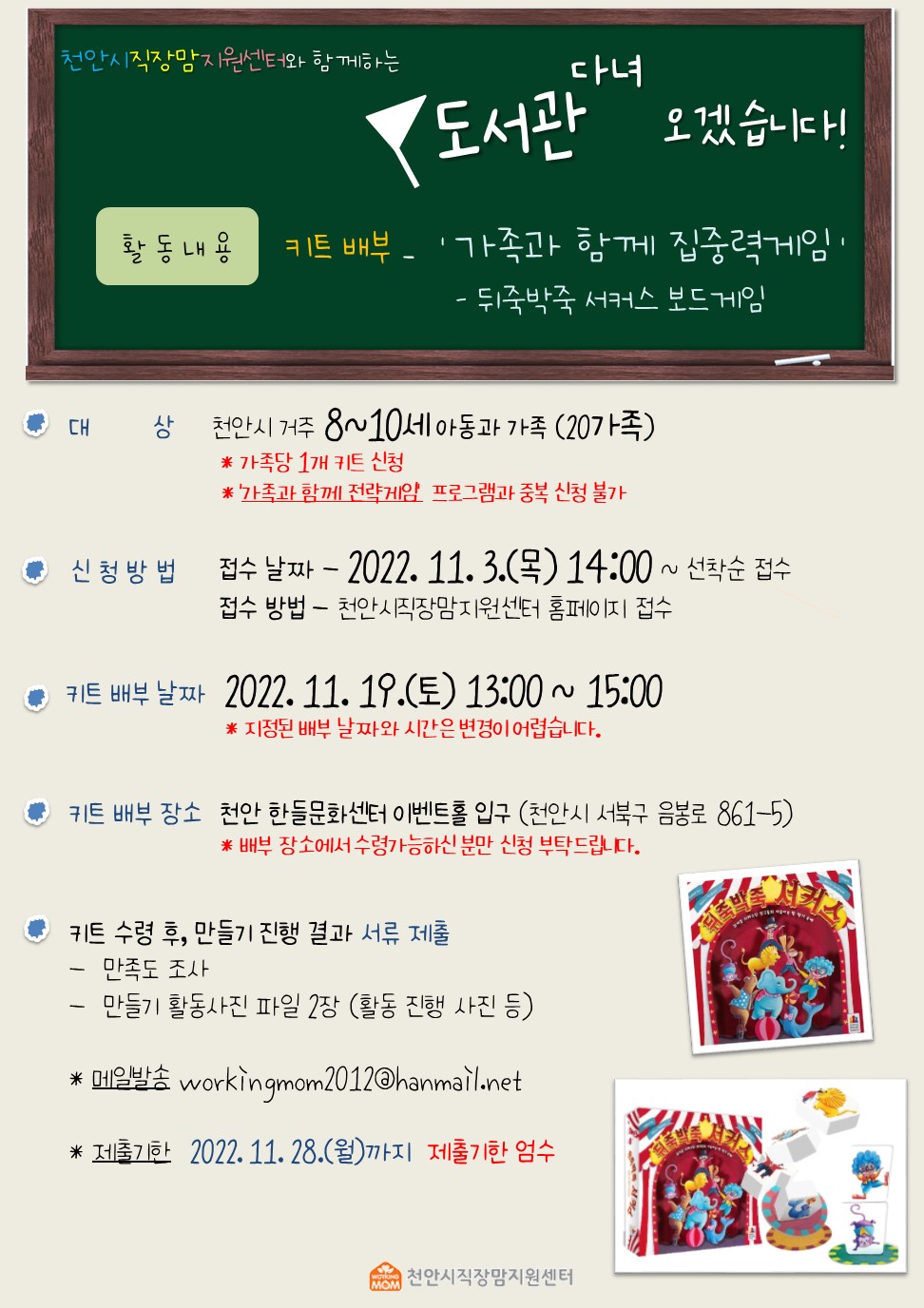 11월 도서관 다녀오겠습니다 프로그램으로 '가족과 함께 집중력게임' 키트 배부를 진행합니다.