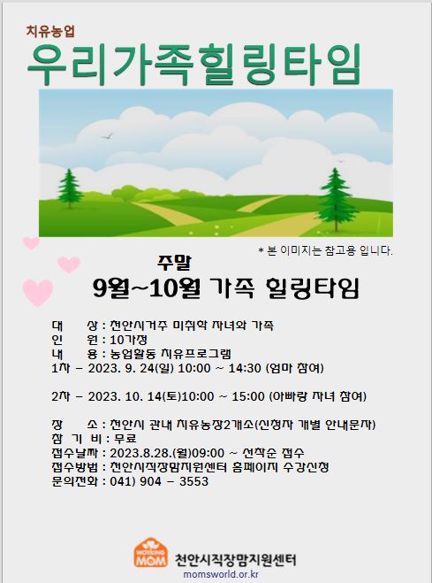 - 대 상 : 천안시 관내 거주 직장맘, 휴직맘 10가정 (다자녀 가정 우선 선정)