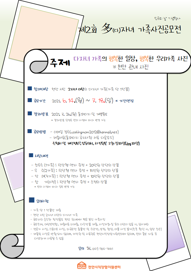 제2회 다자녀 가족사진 가족사진 공모전 (소통참여-공지사항 게시판에서 신청서 다운로드 후, 신청서 및 사진파일 메일 발송!!)