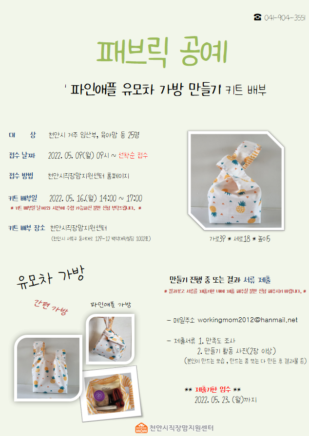 패브릭공예 '파인애플 유모차 가방만들기' 키트 배부를 진행합니다.
