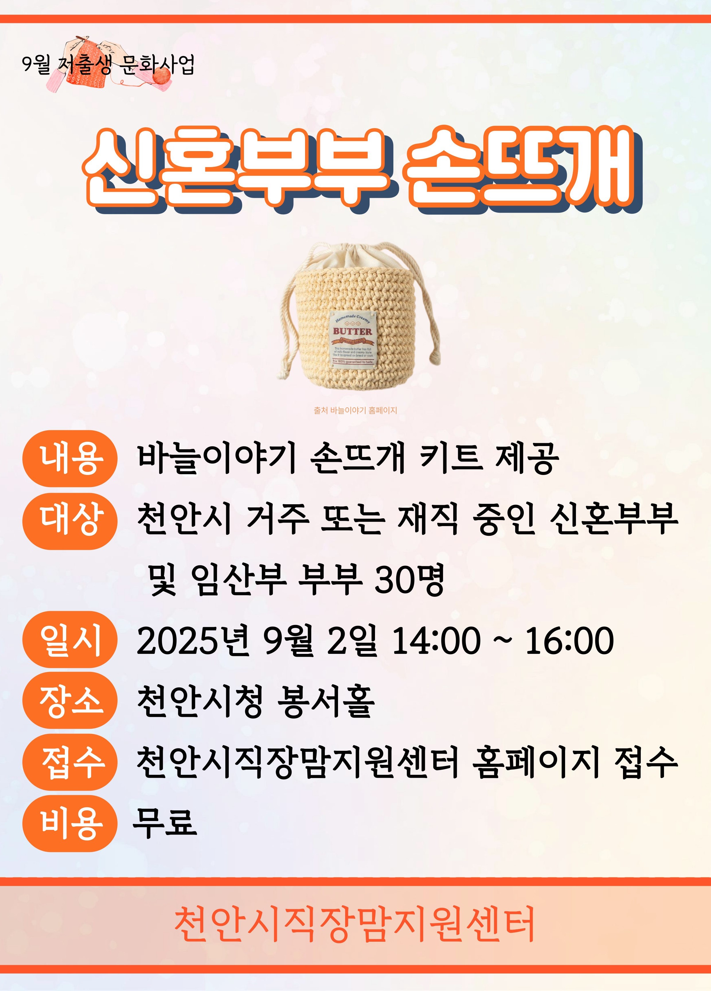 9월 저출생 문화사업은 "신혼부부 손뜨개"로 진행됩니다.