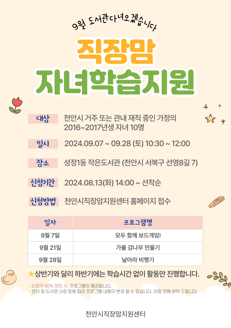 안녕하세요. 천안시직장맘지원센터입니다 : )