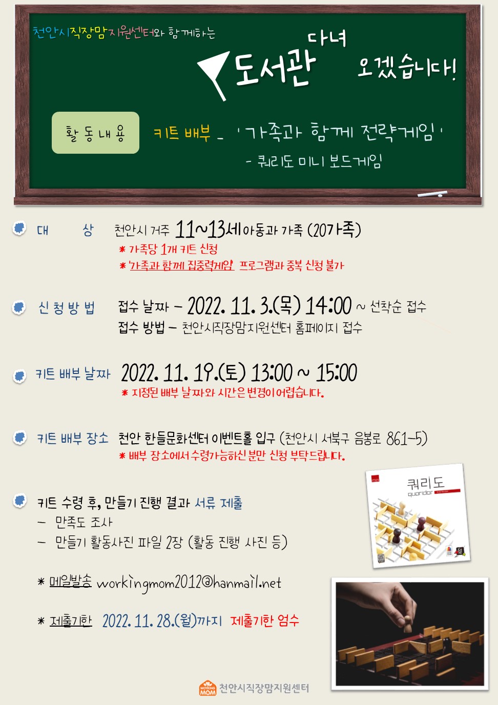 11월 도서관 다녀오겠습니다 프로그램으로 '가족과 함께 전략게임' 키트 배부를 진행합니다.