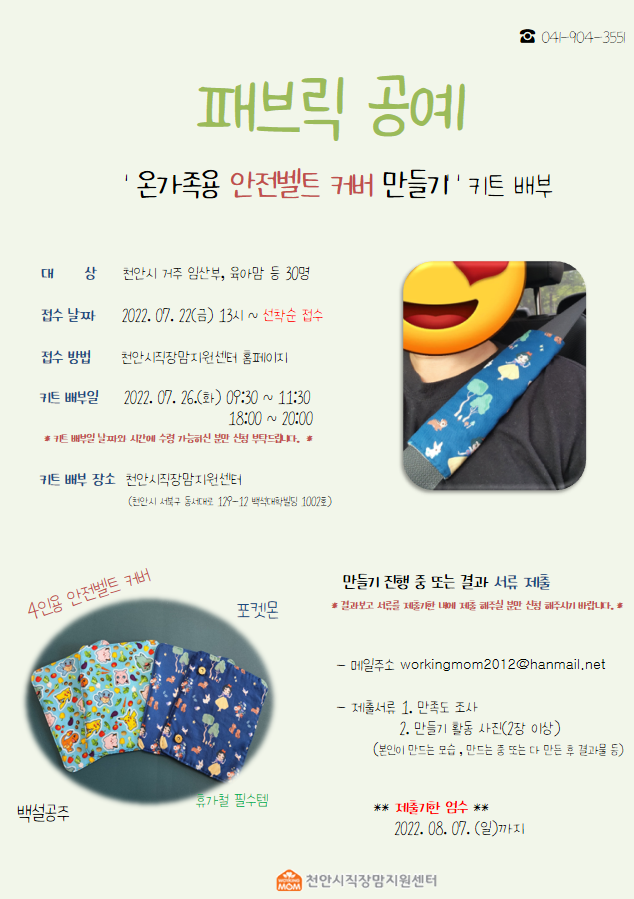 8월 패브릭공예 '온가족용 안전벨트 커버 만들기' 키트 배부를 진행합니다.