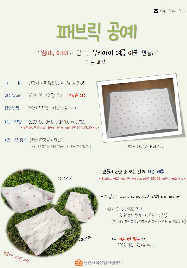 패브릭공예 '엄마아빠가 만드는 우리아이 여름 이불만들기' 키트 배부를 진행합니다.