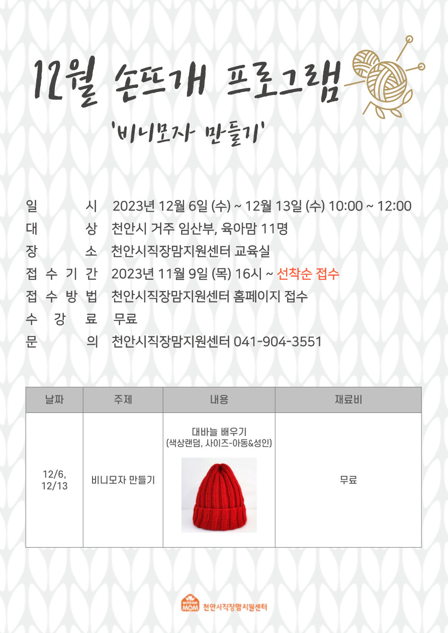 12월 손뜨개 프로그램 [비니모자 만들기] 접수마감