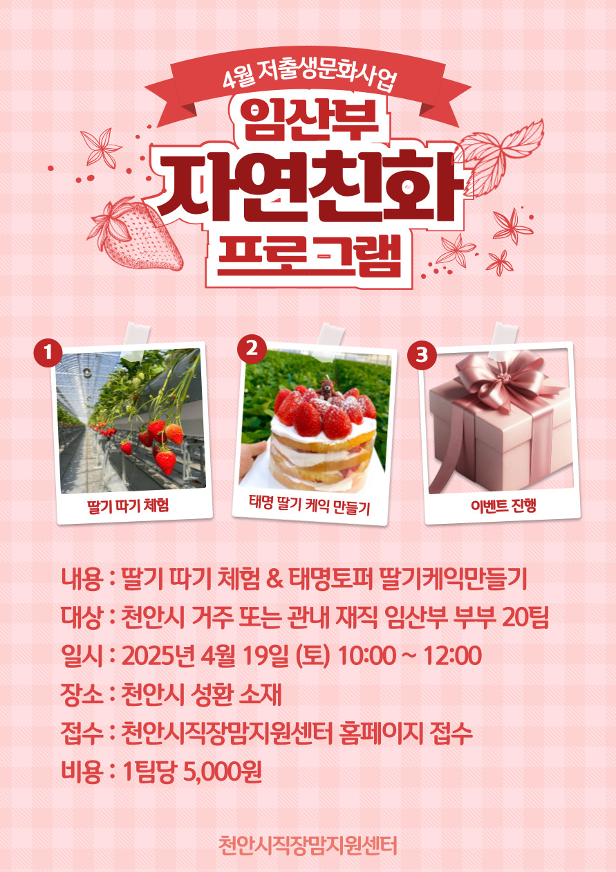 4월 저출생문화사업은 임산부자연친화프로그램(딸기체험&태명토퍼 딸기 케익 만들기)으로 진행됩니다.